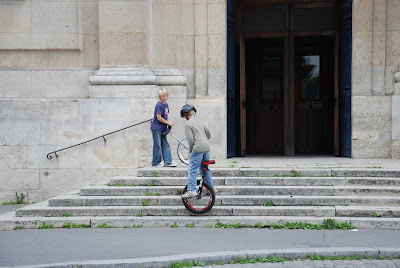 在一个街口,发现了这两个骑独轮车的小朋友。